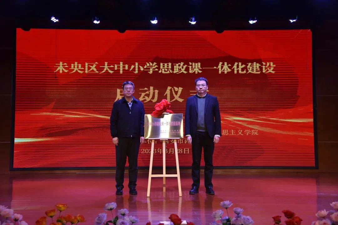 3月28日下午,未央区大中小学思政课一体化建设启动仪式在西航一中举行,万象城官网“陕西大中小学思政教育一体化建设路径研究”项目负责人、校党委副书记郭强和未央区政府副区长王健应邀出席启动仪式并为基地揭牌。未央区教育局党委书记、局长李建新致辞。仪式由未央区教育局党委副书记高小峰主持。