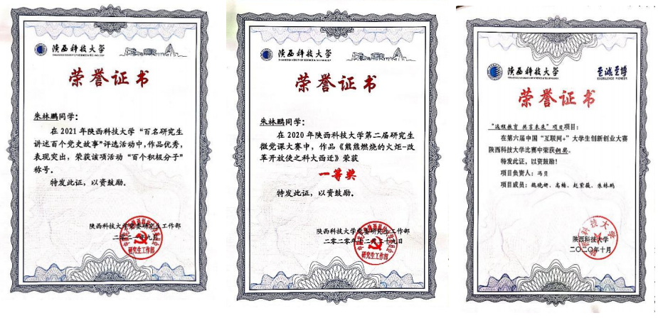 朱林鹏,汉族,中共党员,awc777万象城娱乐官网2019级硕士研究生。担任陕西科技大学“红色基因·薪火传承”党史学习教育研究生宣讲团团长、awc777万象城娱乐官网2019级研究生党支部宣传委员。工作认真踏实,兢兢业业,勇于创新,取得了一系列优异成绩,曾获全国蒲公英公益组织西北爱心支教“优秀志愿者”、陕西科技大学“优秀共产党员”等荣誉。