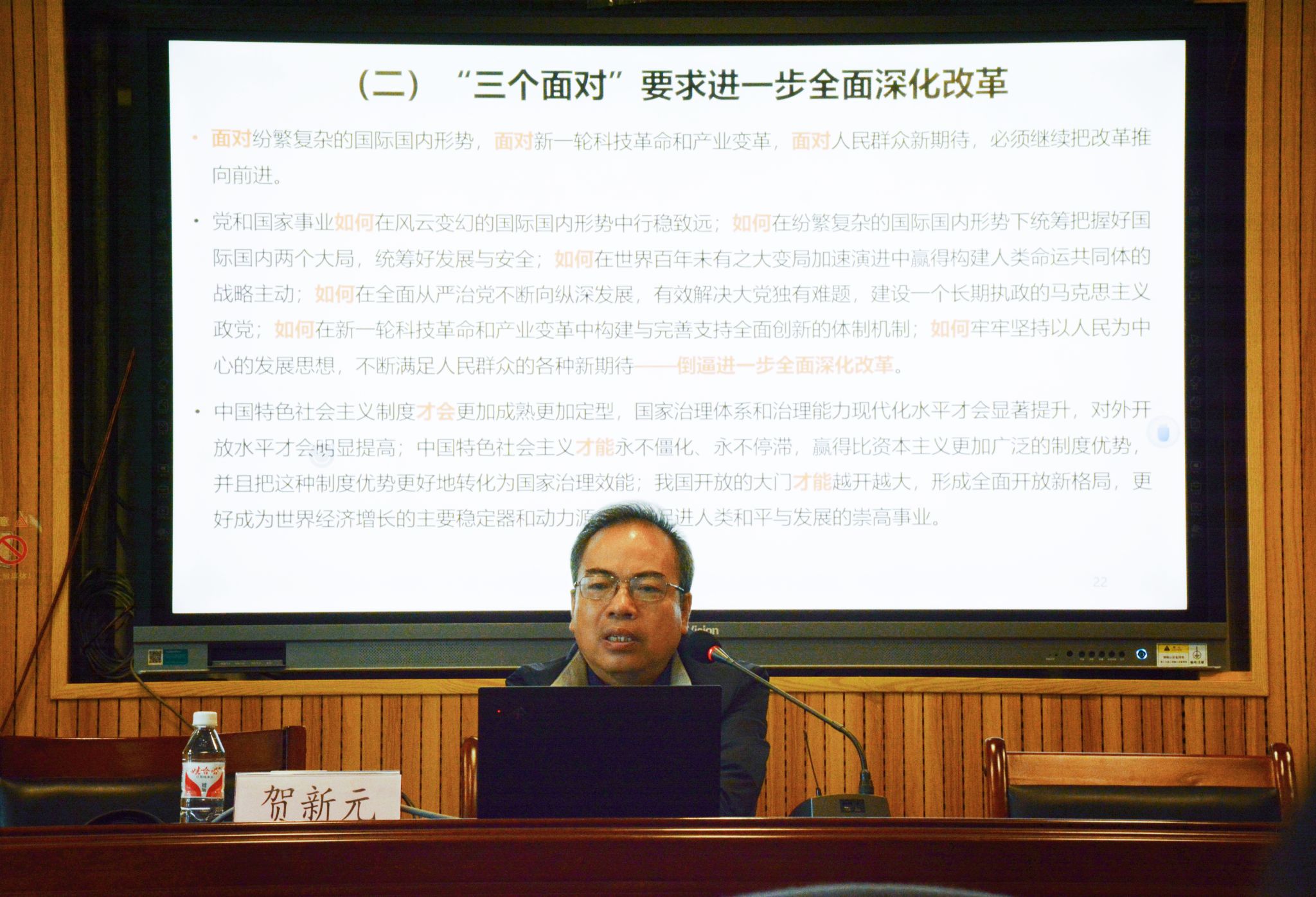 贺新元教授结合党的二十届三中全会精神,围绕为什么要推进中国式现代化,为什么推进中国式现代化要进一步全面深化改革,如何进一步全面深化改革以及进一步全面深化改革、推进中国式现代化必须遵循的原则等重大问题,依次展开详细阐述和深入分析,对师生全面理解和准确把握全会精神具有很强的指导意义。