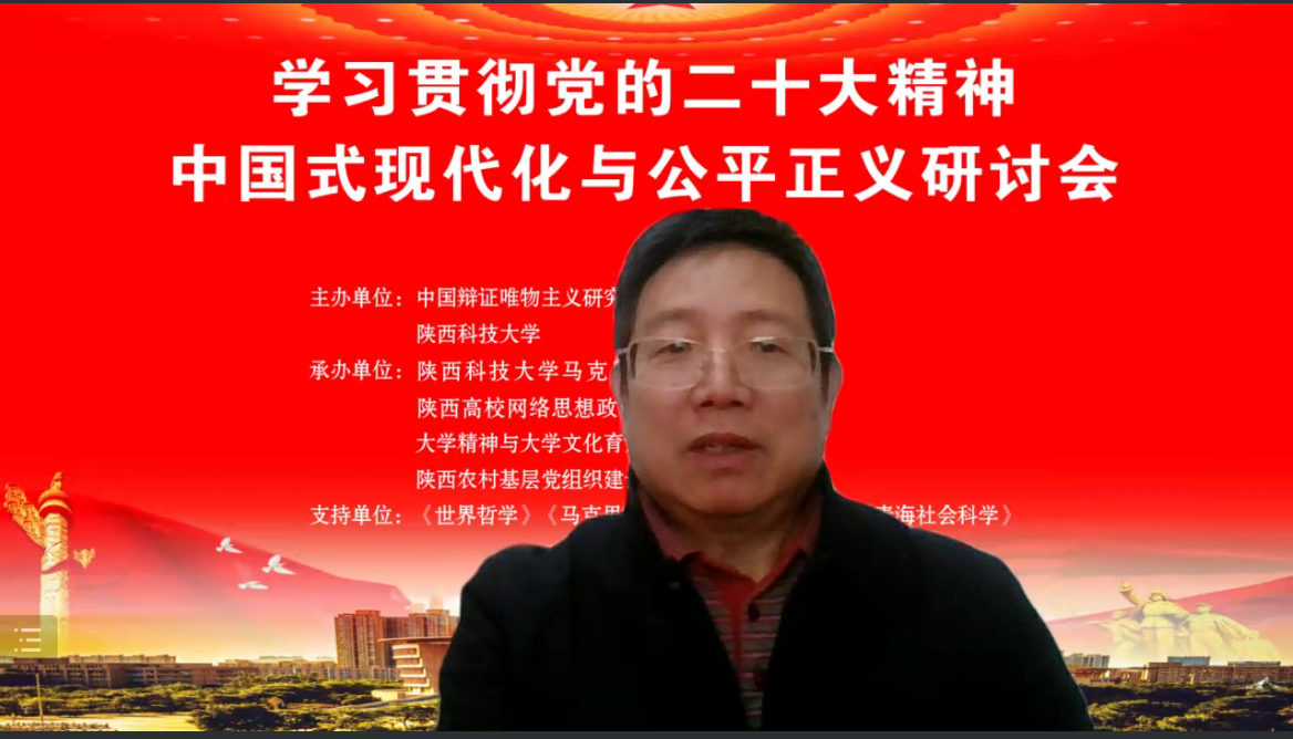 11月26日至27日,由中国辩证唯物主义研究会公平正义研究分会和陕西科技大学共同主办,陕西高校网络思想政治工作中心、大学精神与大学文化研究中心、陕西农村基层党组织建设研究中心联合承办的“学习贯彻党的二十大精神——中国式现代化与公平正义研讨会”在线成功举办。来自中国社会科学院、中央党校、北京大学、吉林大学、同济大学、华中科技大学、西安交通大学、中山大学、厦门大学、兰州大学、西南大学、云南大学、江南大学、湘潭大学、上海师范大学、广西师范大学、awc777万象城娱乐官网、扬州大学、重庆理工大学、成都中医药大学、四川省委党校等国内20余所高校及研究机构和《世界哲学》《思想战线》《青海社会科学》《贵州社会科学》等多家知名期刊的专家学者,聚焦“中国式现代化与公平正义”主题,展开深入研讨交流,汇聚成内容丰富、时效性强、理论水平高的学术盛会。