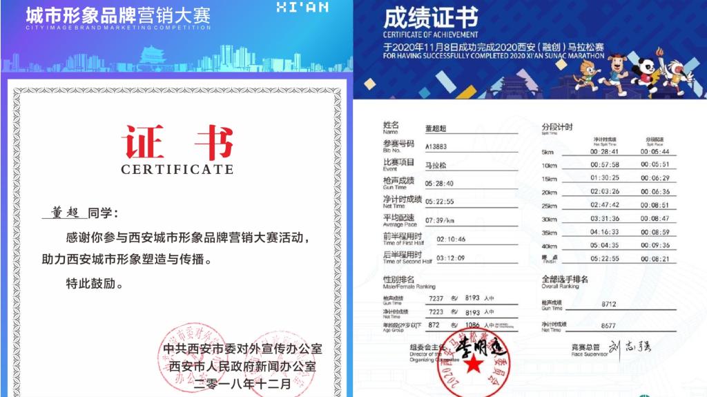 作为新时代的有志青年,我们不仅要对自己的一言一行负责,积极主动的去关注需要帮助的人群。更要肩负起对国家的使命与责任,将小我融入大我,为祖国的发展贡献自己的一份力量。该同学不仅在学校表现优异,更是积极投身社会,绽放属于自己别样的大学生活。闲暇之余还参加了西安2020马拉松赛事,积极响应“全民全运、同心同行”的号召;参加社会公益活动“城市形象品牌营销大赛”,助力西安城市形象塑造与传播。